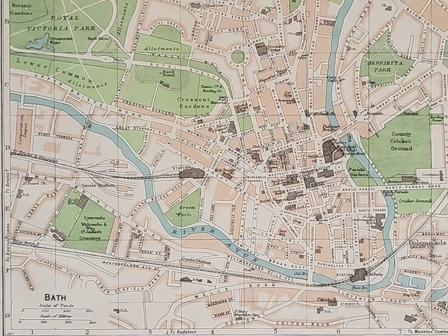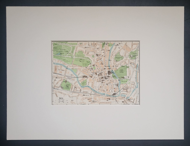 This is an authentic vintage map and was published by Muirhead in 1957. It shows the centre of Bath including The Abbey, Pultney Bridge, The Royal Crescent and many other places of note.