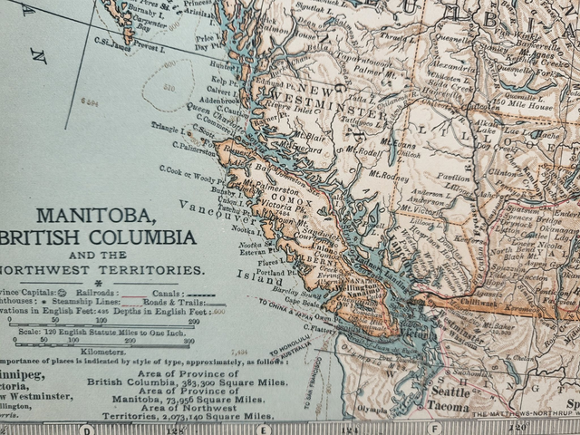 This authentic antique map of southwest Canada was published by Encyclopaedia Britannica in 1903. It is presented in a mount measuring 20 x 16 inches which will fit neatly into a standard-sized frame.