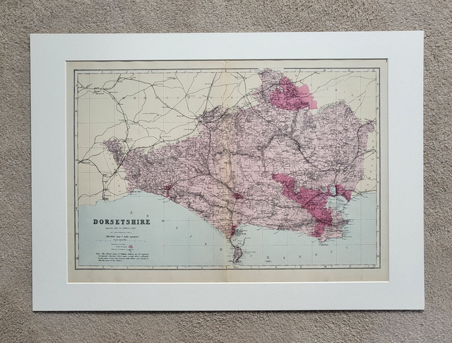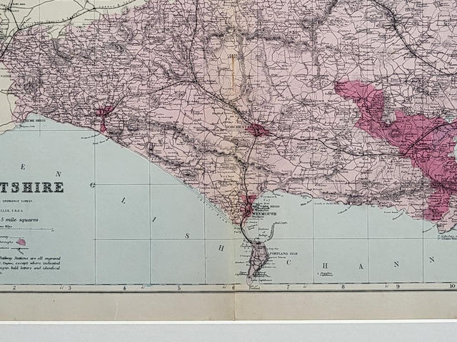 This authentic antique map of 'Dorsetshire' was published in circa. 1863 by Bacon.