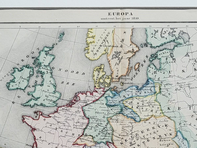 This authentic, hand-coloured antique map was published in The Hague by J. Smulders. It shows the national borders of Europe around 1810. Printed in 1858, it is credited to De Erven Thierry en Mensing.