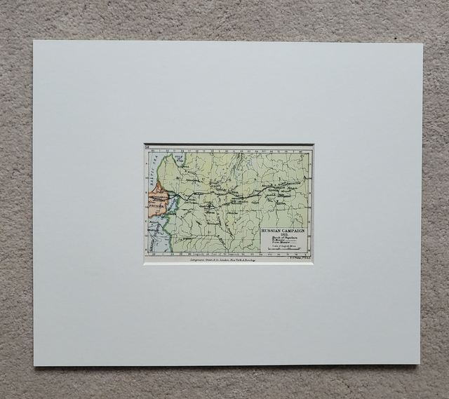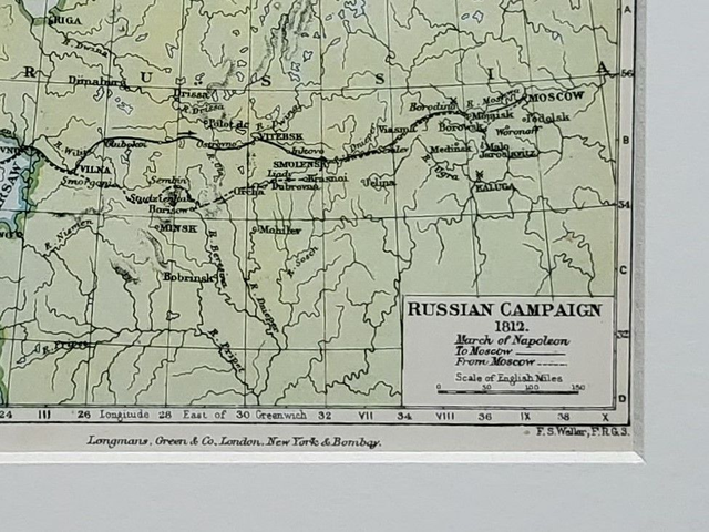 This authentic antique map was published by Longmans, Green in 1899. It shows the route of Napoleon's march to and from Moscow in 1812.
