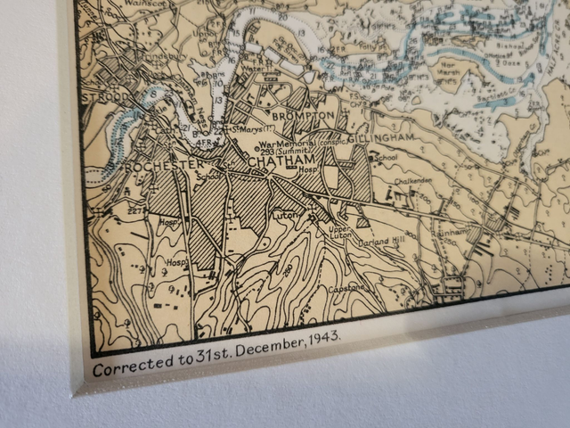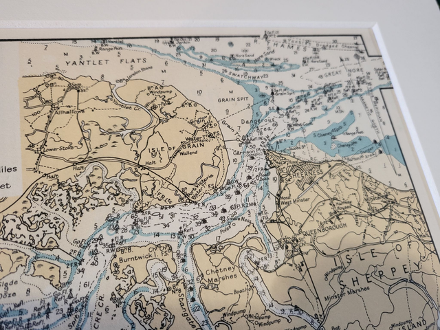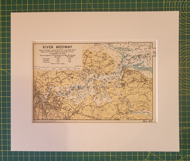 This authentic vintage nautical map shows the lower River Medway, from Rochester to Sheerness and it was published by the British Admiralty in c.1950. It is not explicitly dated, but the bottom left of the map reads: 'Corrected to 31st December 1943,' so it is likely to have been printed a few years after WWII.