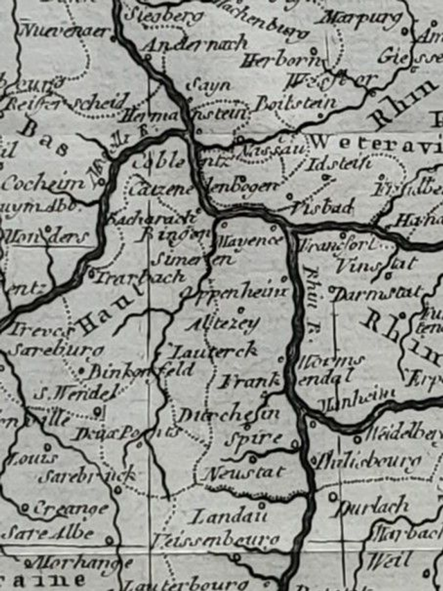 It shows the area surrounding the Middle Rhine, from the confluence with the River Lippe in the north, to Badenweiler in the south.