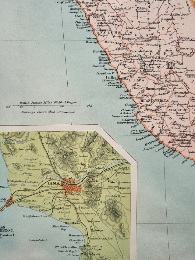 This authentic antique map of NW South America was published by Bartholomew in circa. 1900. It is presented in a mount measuring 20 x 16 inches which will fit neatly into a standard-sized frame.