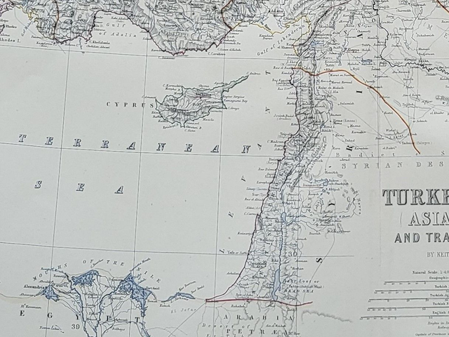 This map was drawn and printed in the days of the Ottoman Empire. Hence, modern day Syria, Lebanon, Israel, Palestine, and other countries in this part of the world were ruled by Turkey.