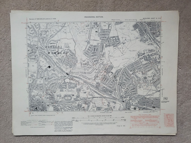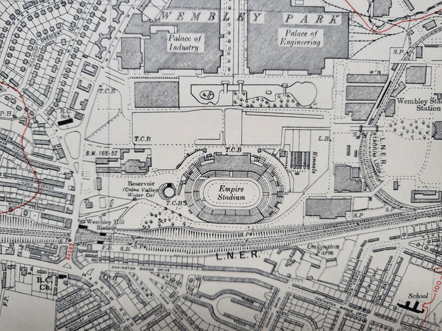The scale is six-inches-to-the mile and the map measures 57 x 43 cm. It is in good condition and very detailed, showing the original Wembley Stadium (see photo 2.)