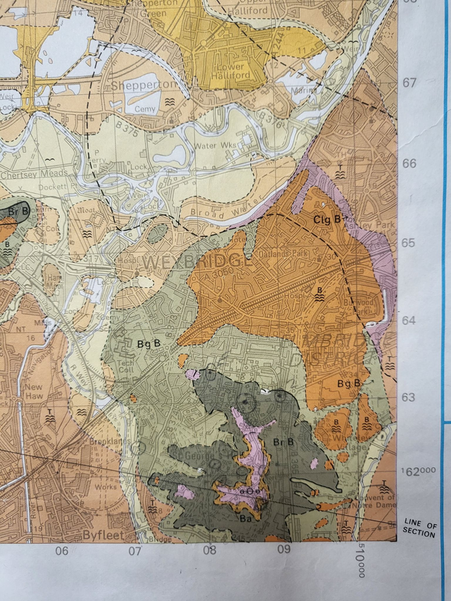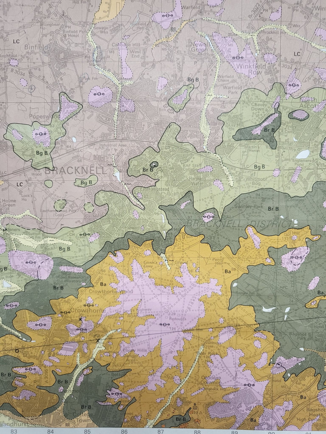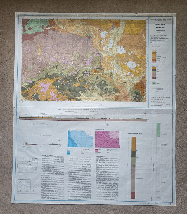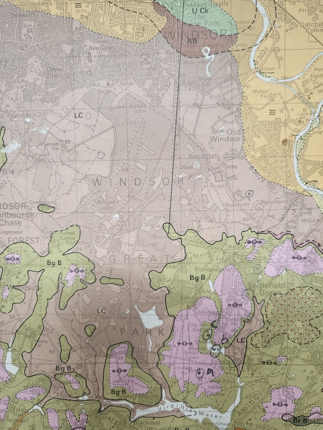 This vintage geological map covers the area around Windsor, and includes Slough, Weybridge and Bracknell.