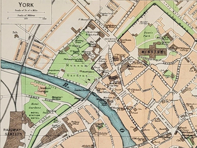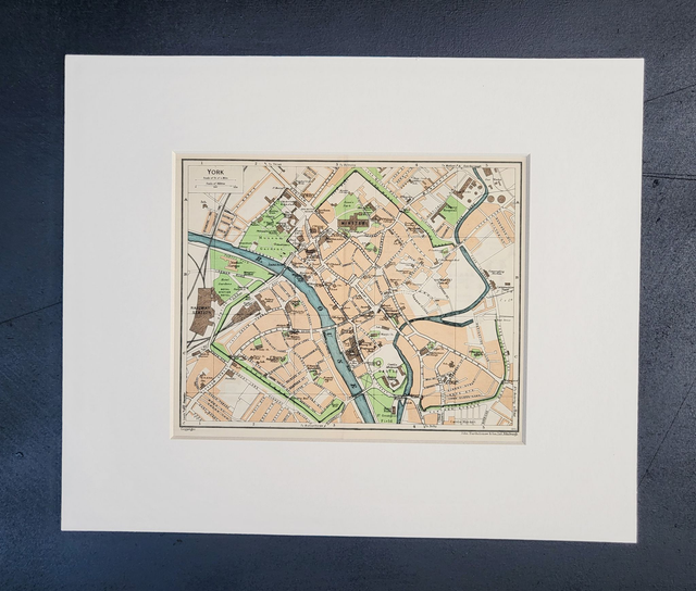 This is an authentic vintage map and was published by Muirhead in 1950. It shows the centre of York including The Minster and other places of note.